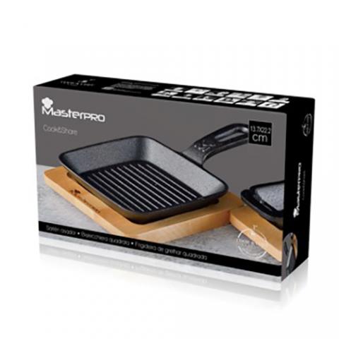 Esta sartén de la colección Cook&Share de Masterpro ofrece una herramienta de alta calidad para cocineros profesionales y principiantes. El diseño ergonómico y su figura con bordes curvos convierten a este instrumento de cocina en una opción ideal para la preparación de alimentos. Se pueden cocinar carnes, vegetales, pescado y demás platos. Su dimensión de 22,2 cm de largo lo hace fácilmente manipulable, con una distribución correcta del peso. La anchura y profundidad de 22,2 cm y 2,2 cm respectivamente, hacen que la capacidad del asador sea mucho mayor.Esta sartén en forma de plancha se encuentra fabricada en hierro fundido, material que es conocido por sus cualidades en cuanto la retención de temperatura durante largos periodos de tiempo. Esto hace que la cocción de los alimentos se realice de forma lenta y progresiva, obteniendo resultados de gran calidad. Al igual que las sartenes de inducción, puede ser utilizado en cocinas halógenas, eléctricas, a base de gas y de vitrocerámica. El asa está especialmente posicionada para mantenerse fuera del alcance directo de las fuentes de calor, brindando maniobrabilidad y cuidando la integridad física de las manos.En la parte interna de la base se encuentra implementada una capa antiadherente que evita que líquidos y objetos sólidos se peguen en la superficie. De esta manera se reducen los daños ocasionados en la integridad superficial de la sartén, además de facilitar la limpieza posterior una vez terminada la preparación. El color negro de estas sartenes dan un toque más estilístico y serio a cualquier tipo de estilo de cocina. El tamaño pequeño de su presentación hace que sea portable o que pueda guardarse en sitios pequeños, sin abarcar mucho espacio. Fácil de lavar y de secar a través de métodos convencionales.Cumple con los estándares más exigentes de cualquier cocinero, ofreciendo resultados rápidos y satisfactorios. Puede ser utilizado en múltiples ocasiones sin perder sus cualidades de retención de temperatura y de antiadherencia. El asa posee una ranura a lo largo de su estructura que le permite ser colgada en la pared para objetivos más funcionales. Con una textura fuerte y de alta resistencia a golpes y caídas.