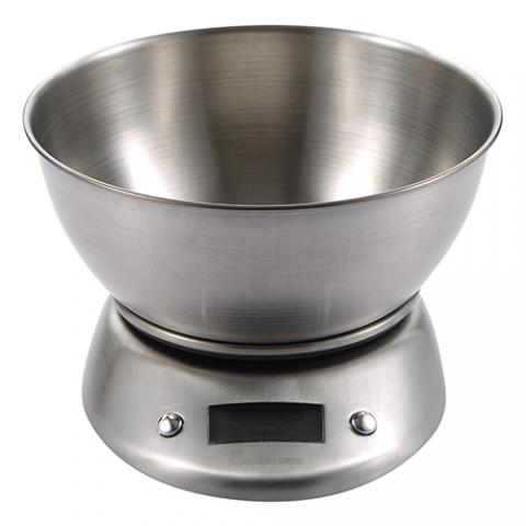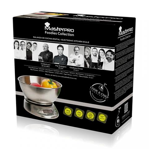 Masterpro Foodies - Balanza Electrónica 1600 ml Acero Inoxidable, con Pantalla LCD, Incluye Bol de Acero Inoxidable con Fondo Plástico, Capacidad 5 Kg, Ajuste al Gramo, Dimensiones LCD 4.9 x 1.8 cm