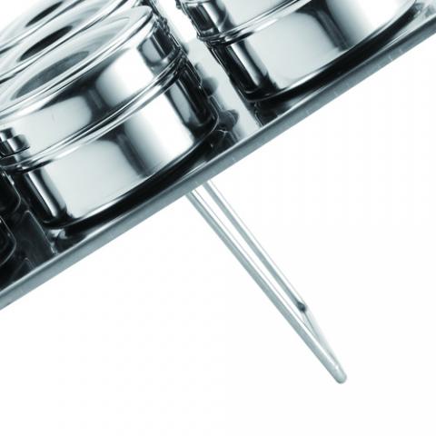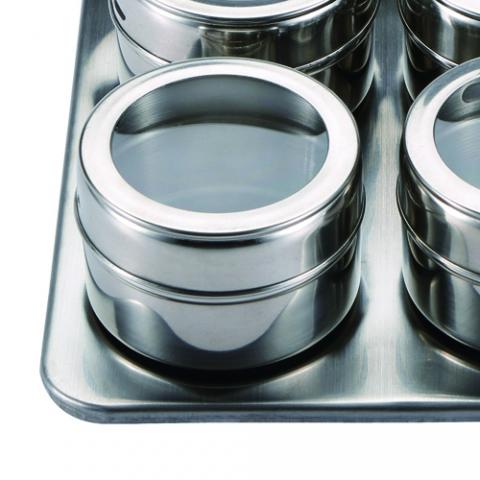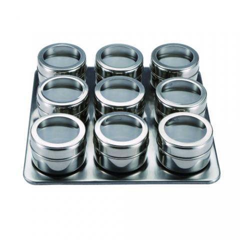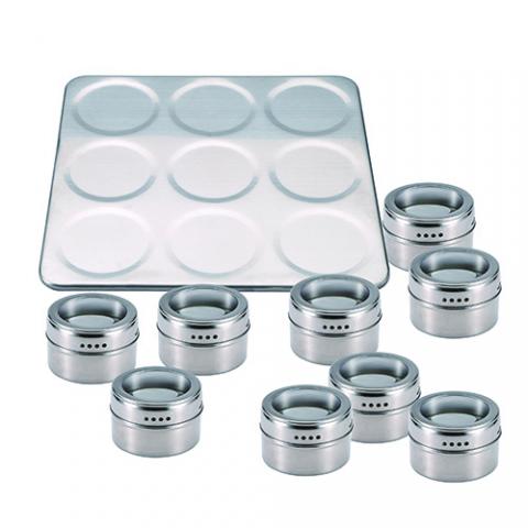 • El set incluye nueve botes para especias de 6,3x4,3cm y un soporte magnético de 23x23x5cm.