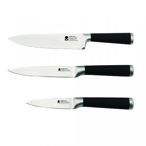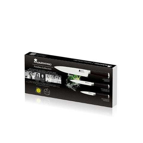 Masterpro Foodies - Set 3 Cuchillos Acero Inoxidable, 1 Cuchillo Chef 20 cm, 1 Cuchillo Multiusos 12.5 cm, 1 Cuchillo Pelador 8.75 cm, con Mango Hueco, Mango Ergonómico con Revestimiento de Silicona