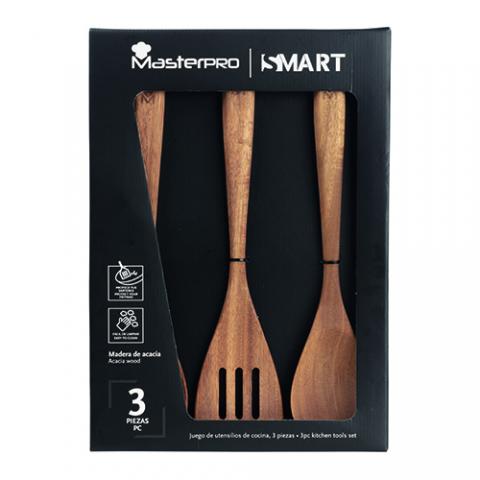 Masterpro Smart - Juego de 3 Utensilios de Cocina de Madera de Acacia compuesto por 1 Cuchara, 1 Espátula Ranurada y 1 Cucharón, Apta para lavavajillas, Libre de Tóxicos