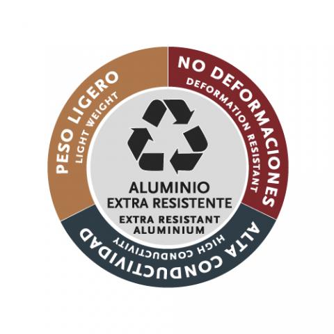 • Buena distribución del calor. El aluminio forjado presente en la composición de este utensilio provee de diversas propiedades que benefician al cocinado de los alimentos; destaca la distribución térmica uniforme en toda su superficie.